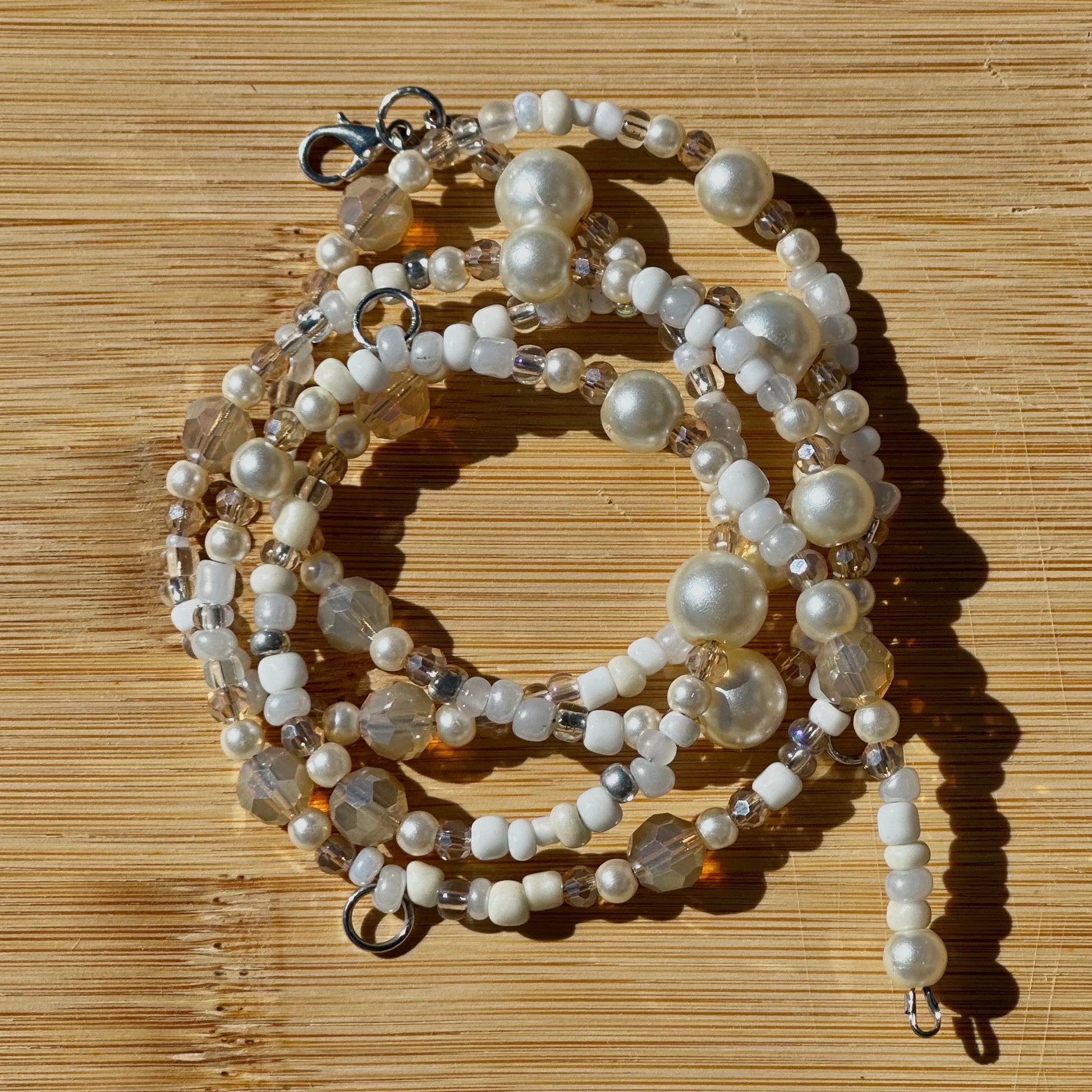 An alluring pearl beaded waistbead that captures the essence of summer elegance. With lustrous pearls shimmering like bubbles in your favorite drink, this stunning piece effortlessly enhances your waistline, making it perfect for a sun-kissed day.